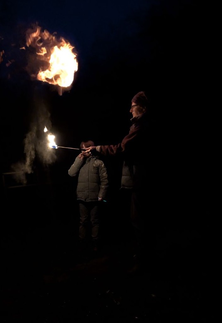 Neu in diesem Jahr war das Feuerspucken. Mit „Drachenzungen“ und Bärlappsporen boten wir eine sichere Methode an, die auch Kinder gut bewältigen können. Dieses Angebot war am schnellsten ausgebucht, Feuer ist einfach in jedem Alter faszinierend. Die meisten Kinder haben erfolgreich schöne Flammen gespuckt, andere genossen das Schauspiel beim Zuschauen. Vielleicht trauen sie sich im nächsten Jahr.