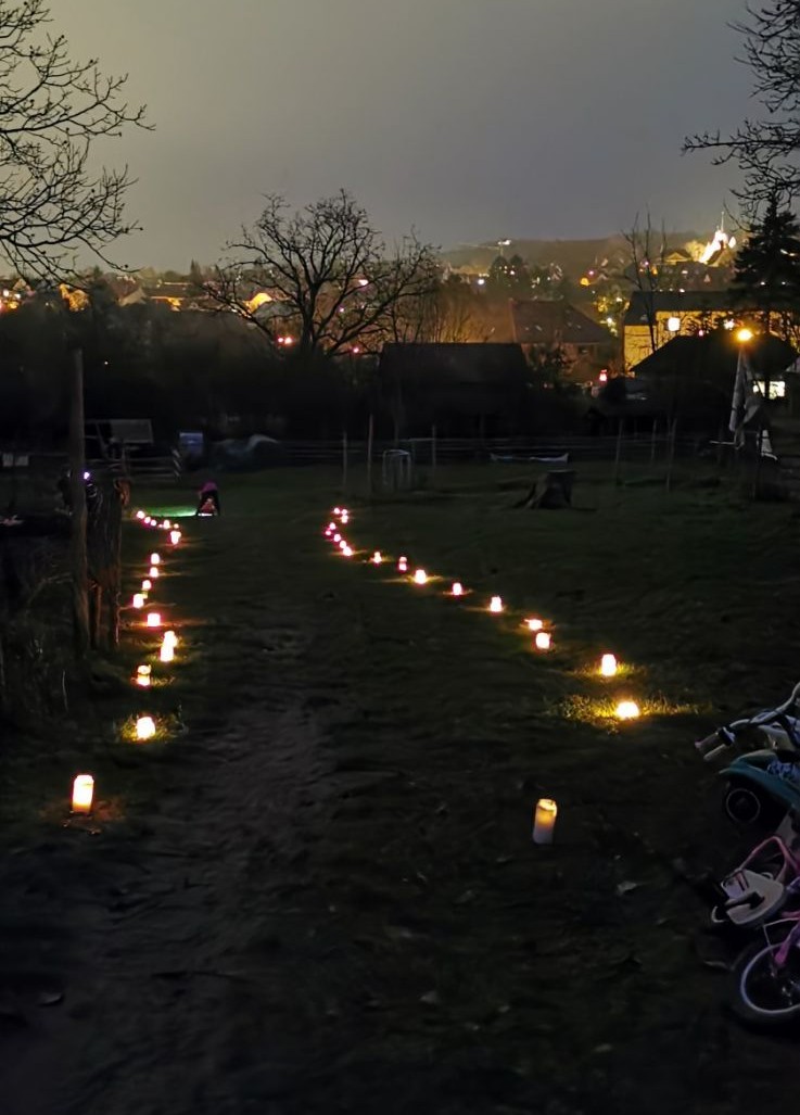 Wir haben festgestellt, dass die meisten Kinder mit Dunkelheit eher etwas Unangenehmes verbinden. Wenn es dunkel wird, müssen die Kinder zu Hause sein. Wenn es dunkel wird, macht man schnell das Licht an und vertreibt die Dunkelheit. Auf der Farm wollen wir den Kindern positive Erfahrungen in der Dunkelheit ermöglichen. Sehr beliebt ist unser nächtliches Bobbycarrennen. Die Wegstrecke wird mit Windlichtern beleuchtet, an das Bobbycar kleben wir zwei Taschenlampen. Und dann sausen die Kinder den Hang hinunter und wir stoppen die Zeit. Unsere „Goldmedaillen“ sind sehr begehrt, die Kinder sind mit körperlichem Einsatz und viel Spaß ganz dabei.